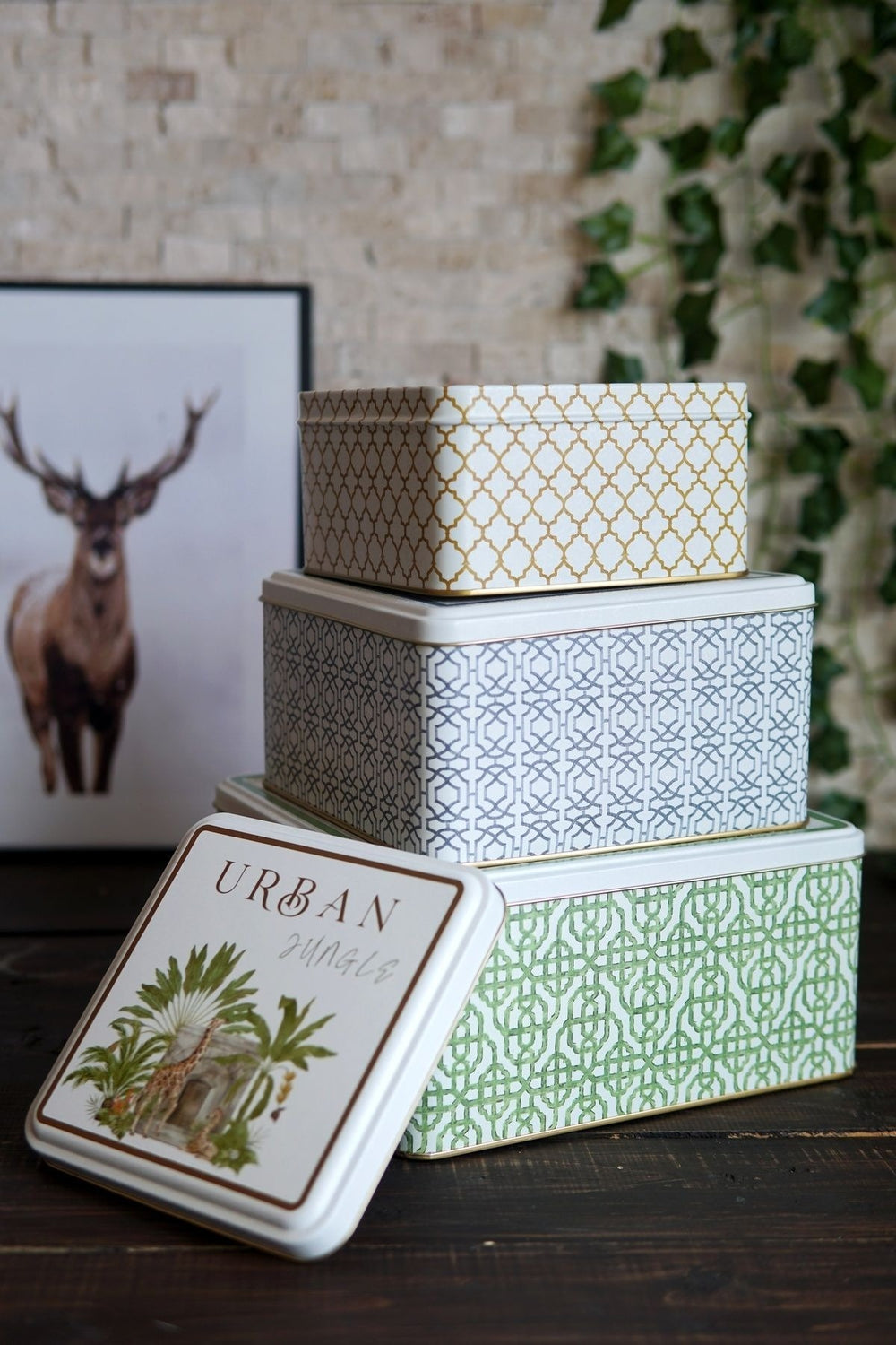 Evinizde hem şıklığı hem de düzeni bir arada sunan bu jungle desenli 3'lü kare metal saklama kabı seti ile tanışın! Doğadan ilham alan özel desenleri ve farklı hacimleriyle mutfakta, kilerde ya da dekoratif amaçlı kullanım için mükemmeldir.