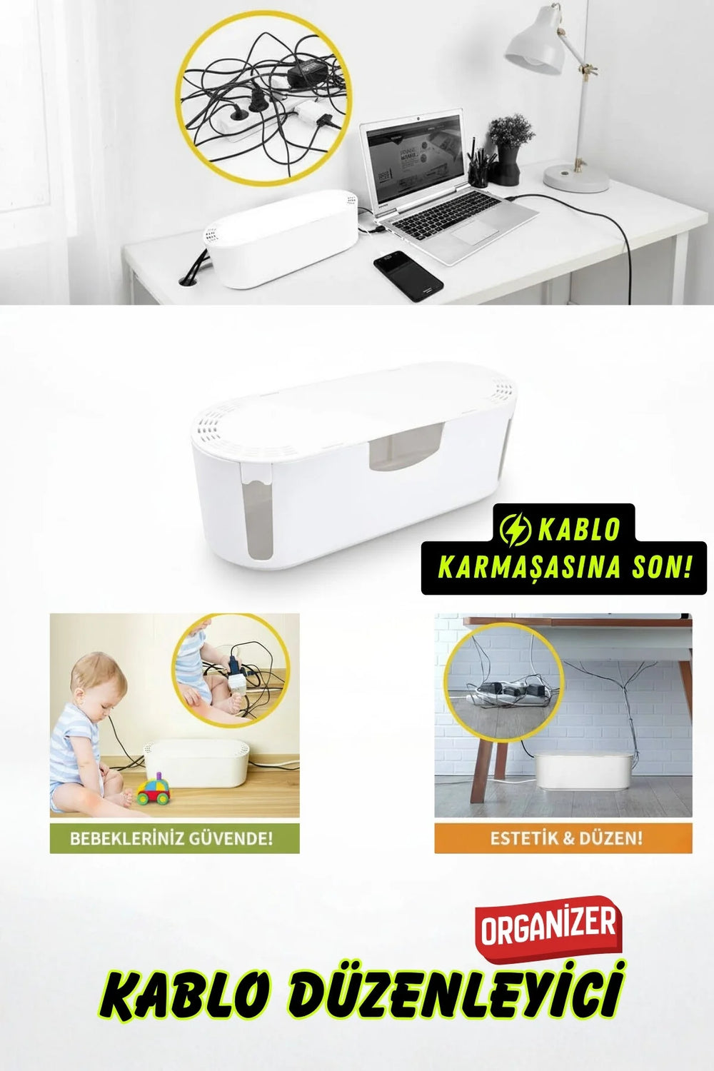 Masa üstü ve TV ünitesi çevresindeki kablo karmaşasını tek hamlede toparlayın. Priz, adaptör ve fazla kabloları kutu içinde saklayarak daha temiz, güvenli ve estetik bir alan oluşturur.